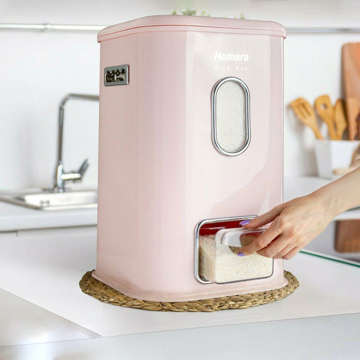 جا برنجی همارا، از جنس پلاستیک است. گنجایش این محصول 14 کیلو می باشد. پیمانه این جا برنجی از جنس اکریلیک است که با فشار به سمت جلو پیمانه از برنج پر می شود.
