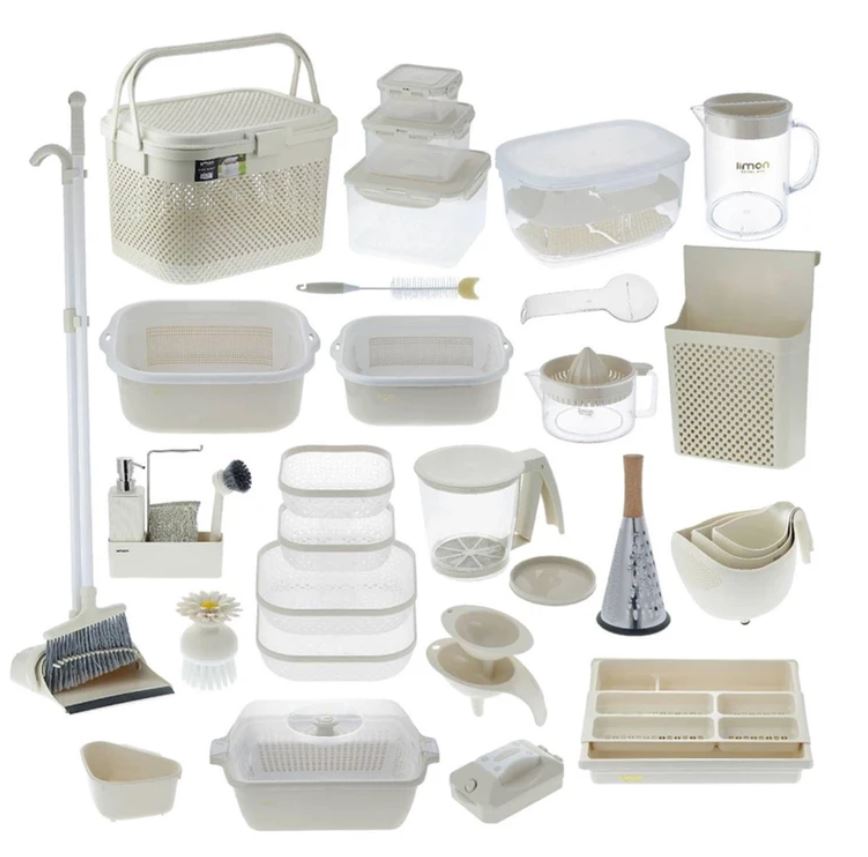 سرویس جهیزیه ۴۹ پارچه شامل تمام وسایل مورد نیاز آشپزخانه است؛ از ابزار نظافتی تا ظروف نگهدارنده و اقلام نظمدهنده.