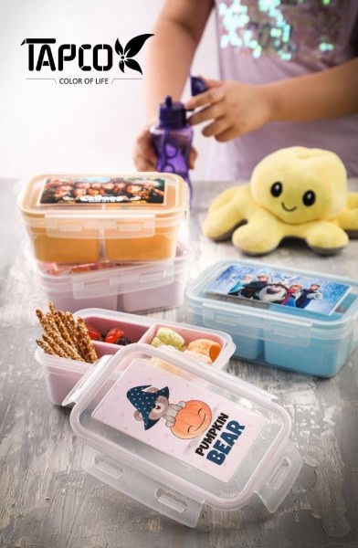 ظرف غذای کودک دخترانه و پسرانه از برند تاپکو جنس پلاستیک بهداشتی با گرید مواد غذایی، 3 قسمته با قابلیت جدا شوندگی هر قسمت، با درب دارای قفل هوا برای ماندگاری بیشتر و همچنین جلوگیری از چپه شدن مواد غذایی داخل کیف مدرسه و مهدکودک با مقاومت بسیار عالی در برابر فشار و ضربه را دارد.